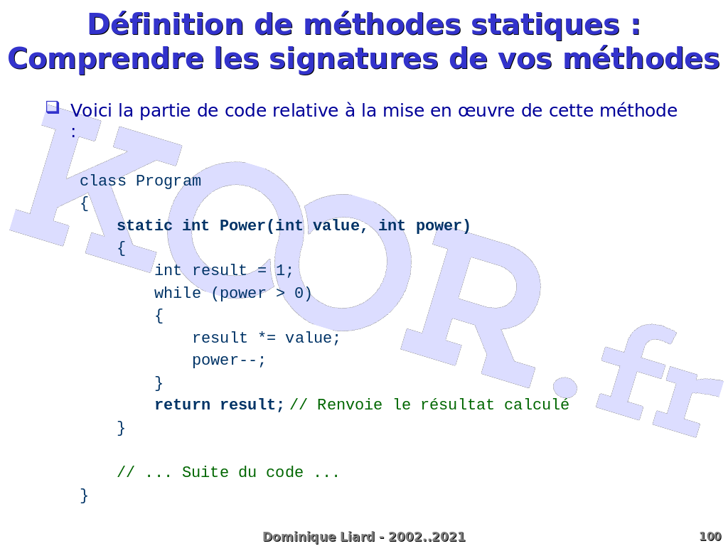 Définition de méthodes statiques :Comprendre les signatures de vos méthodes Voici la partie de code relative à la mise en ?uvre de cette méthode : class Program { static int Power(int value, int power) { int result = 1; while (power > 0) { result *= value; power--; } return result; // Renvoie le résultat calculé } // ... Suite du code ... } Dominique Liard - 2002..2021