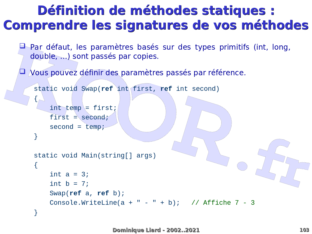 Définition de méthodes statiques :Comprendre les signatures de vos méthodes Par défaut, les paramètres basés sur des types primitifs (int, long, double, ?) sont passés par copies. Vous pouvez définir des paramètres passés par référence. static void Swap(ref int first, ref int second) { int temp = first; first = second; second = temp; } static void Main(string[] args) { int a = 3; int b = 7; Swap(ref a, ref b); Console.WriteLine(a + " - " + b); // Affiche 7 - 3 } Dominique Liard - 2002..2021