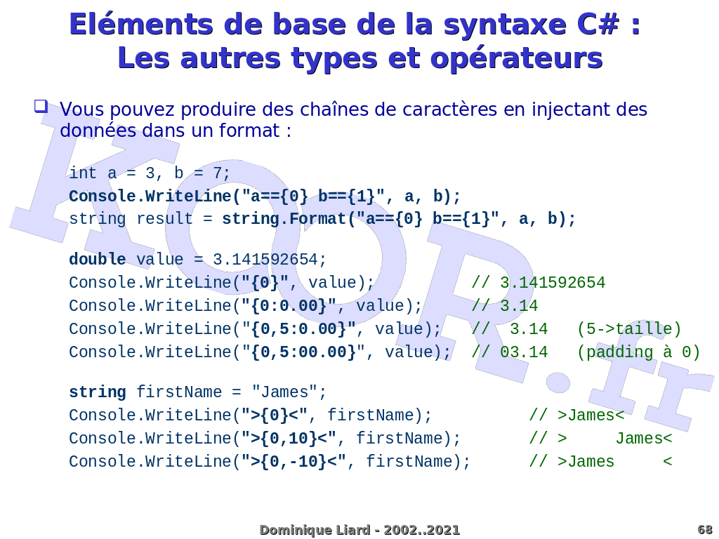 Eléments de base de la syntaxe C# : Les autres types et opérateurs Vous pouvez produire des chaînes de caractères en injectant des données dans un format : int a = 3, b = 7; Console.WriteLine("a=={0} b=={1}", a, b); string result = string.Format("a=={0} b=={1}", a, b); double value = 3.141592654; Console.WriteLine("{0}", value); // 3.141592654 Console.WriteLine("{0:0.00}", value); // 3.14 Console.WriteLine("{0,5:0.00}", value); // 3.14 (5->taille) Console.WriteLine("{0,5:00.00}", value); // 03.14 (padding à 0) string firstName = "James"; Console.WriteLine(">{0}<", firstName); // >James< Console.WriteLine(">{0,10}<", firstName); // > James< Console.WriteLine(">{0,-10}<", firstName); // >James < Dominique Liard - 2002..2021