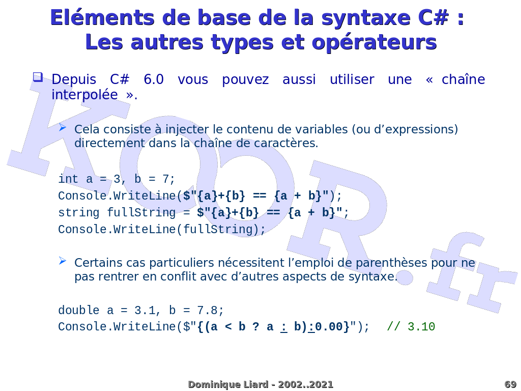 Eléments de base de la syntaxe C# : Les autres types et opérateurs Depuis C# 6.0 vous pouvez aussi utiliser une « chaîne interpolée ». Cela consiste à injecter le contenu de variables (ou d'expressions) directement dans la chaîne de caractères. int a = 3, b = 7; Console.WriteLine($"{a}+{b} == {a + b}"); string fullString = $"{a}+{b} == {a + b}"; Console.WriteLine(fullString); Certains cas particuliers nécessitent l'emploi de parenthèses pour ne pas rentrer en conflit avec d'autres aspects de syntaxe. double a = 3.1, b = 7.8; Console.WriteLine($"{(a < b ? a : b):0.00}"); // 3.10 Dominique Liard - 2002..2021