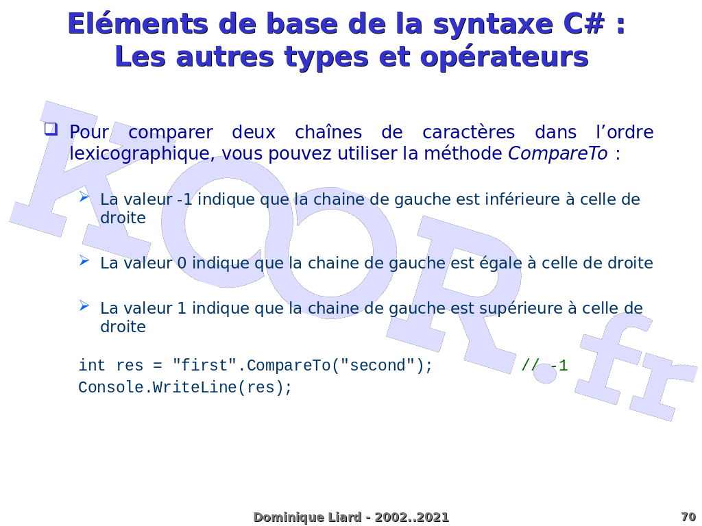 Eléments de base de la syntaxe C# : Les autres types et opérateurs Pour comparer deux chaînes de caractères dans l'ordre lexicographique, vous pouvez utiliser la méthode CompareTo : La valeur -1 indique que la chaine de gauche est inférieure à celle de droite La valeur 0 indique que la chaine de gauche est égale à celle de droite La valeur 1 indique que la chaine de gauche est supérieure à celle de droite int res = "first".CompareTo("second"); // -1 Console.WriteLine(res); Dominique Liard - 2002..2021