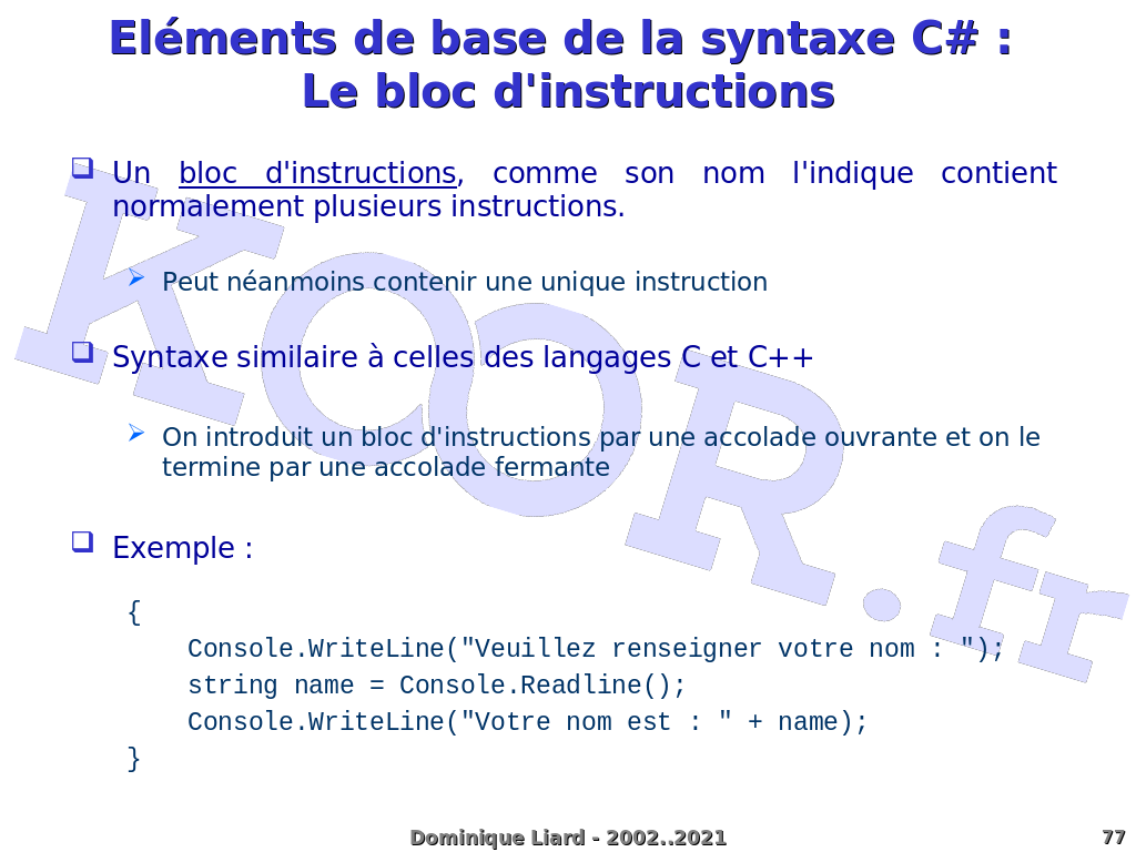 Eléments de base de la syntaxe C# : Le bloc d'instructions Un bloc d'instructions, comme son nom l'indique contient normalement plusieurs instructions. Peut néanmoins contenir une unique instruction Syntaxe similaire à celles des langages C et C++ On introduit un bloc d'instructions par une accolade ouvrante et on le termine par une accolade fermante Exemple : { Console.WriteLine("Veuillez renseigner votre nom : "); string name = Console.Readline(); Console.WriteLine("Votre nom est : " + name); } Dominique Liard - 2002..2021