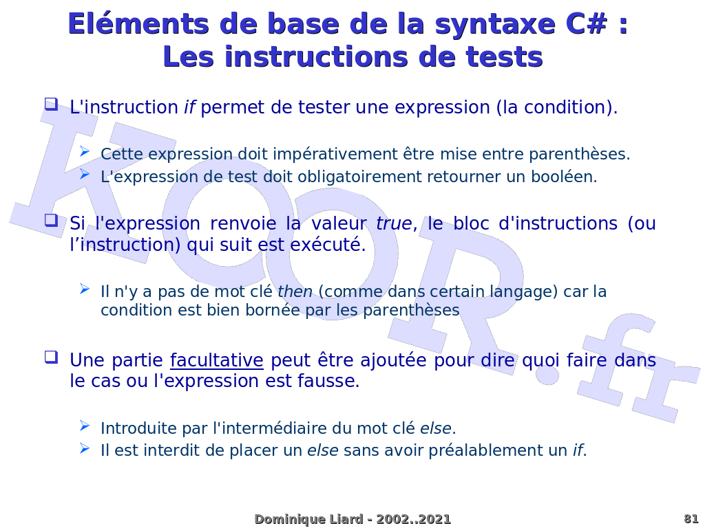 Eléments de base de la syntaxe C# : Les instructions de tests L'instruction if permet de tester une expression (la condition). Cette expression doit impérativement être mise entre parenthèses. L'expression de test doit obligatoirement retourner un booléen. Si l'expression renvoie la valeur true, le bloc d'instructions (ou l'instruction) qui suit est exécuté. Il n'y a pas de mot clé then (comme dans certain langage) car la condition est bien bornée par les parenthèses Une partie facultative peut être ajoutée pour dire quoi faire dans le cas ou l'expression est fausse. Introduite par l'intermédiaire du mot clé else. Il est interdit de placer un else sans avoir préalablement un if. Dominique Liard - 2002..2021