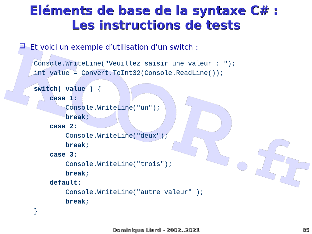 Eléments de base de la syntaxe C# : Les instructions de tests Et voici un exemple d'utilisation d'un switch : Console.WriteLine("Veuillez saisir une valeur : "); int value = Convert.ToInt32(Console.ReadLine()); switch( value ) { case 1: Console.WriteLine("un"); break; case 2: Console.WriteLine("deux"); break; case 3: Console.WriteLine("trois"); break; default: Console.WriteLine("autre valeur" ); break; } Dominique Liard - 2002..2021