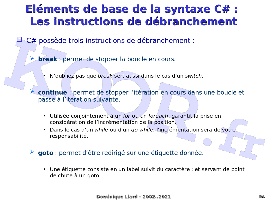 Eléments de base de la syntaxe C# : Les instructions de débranchement C# possède trois instructions de débranchement : break : permet de stopper la boucle en cours. N'oubliez pas que break sert aussi dans le cas d'un switch. continue : permet de stopper l'itération en cours dans une boucle et passe à l'itération suivante. Utilisée conjointement à un for ou un foreach, garantit la prise en considération de l'incrémentation de la position. Dans le cas d'un while ou d'un do while, l'incrémentation sera de votre responsabilité. goto : permet d'être redirigé sur une étiquette donnée. Une étiquette consiste en un label suivit du caractère : et servant de point de chute à un goto. Dominique Liard - 2002..2021