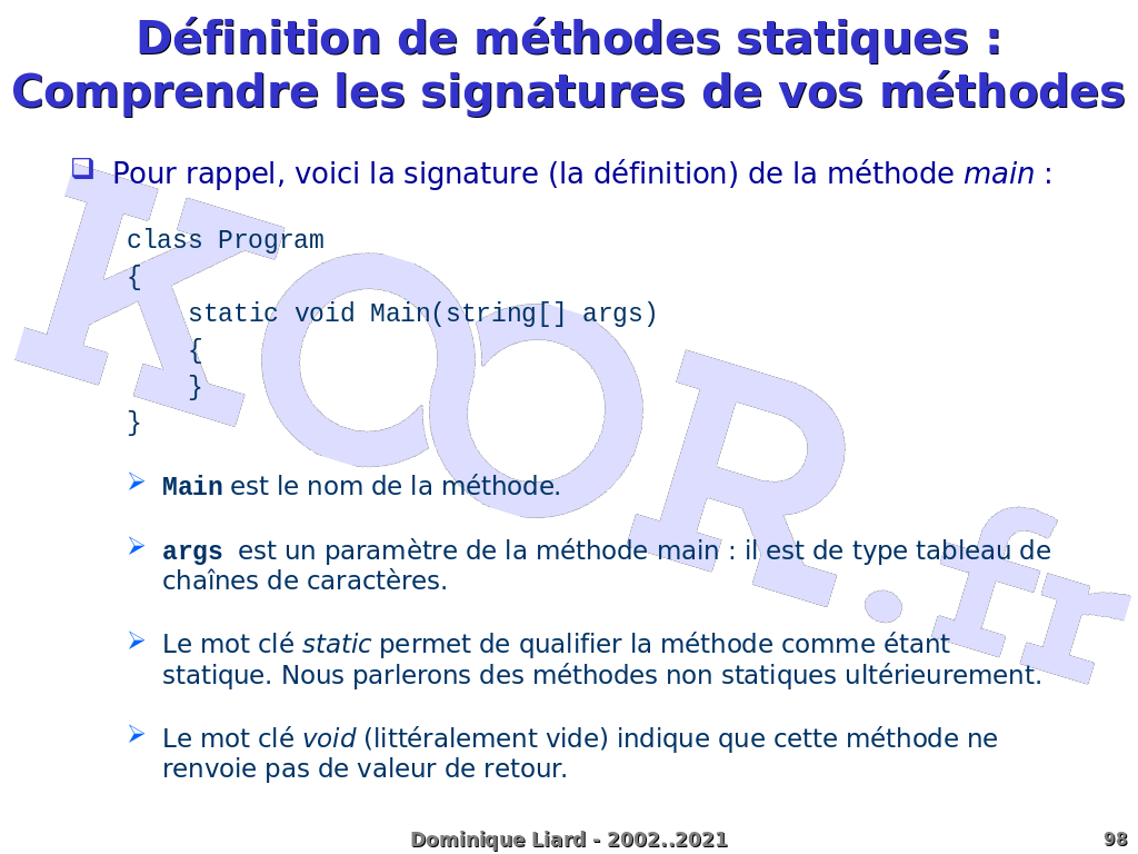 Définition de méthodes statiques :Comprendre les signatures de vos méthodes Pour rappel, voici la signature (la définition) de la méthode main : class Program { static void Main(string[] args) { } } Main est le nom de la méthode. args est un paramètre de la méthode main : il est de type tableau de chaînes de caractères. Le mot clé static permet de qualifier la méthode comme étant statique. Nous parlerons des méthodes non statiques ultérieurement. Le mot clé void (littéralement vide) indique que cette méthode ne renvoie pas de valeur de retour. Dominique Liard - 2002..2021