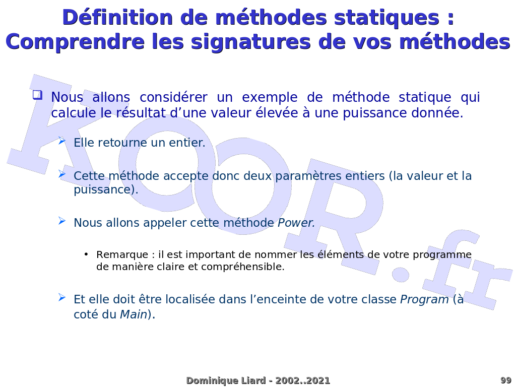 Définition de méthodes statiques :Comprendre les signatures de vos méthodes Nous allons considérer un exemple de méthode statique qui calcule le résultat d'une valeur élevée à une puissance donnée. Elle retourne un entier. Cette méthode accepte donc deux paramètres entiers (la valeur et la puissance). Nous allons appeler cette méthode Power. Remarque : il est important de nommer les éléments de votre programme de manière claire et compréhensible. Et elle doit être localisée dans l'enceinte de votre classe Program (à coté du Main). Dominique Liard - 2002..2021