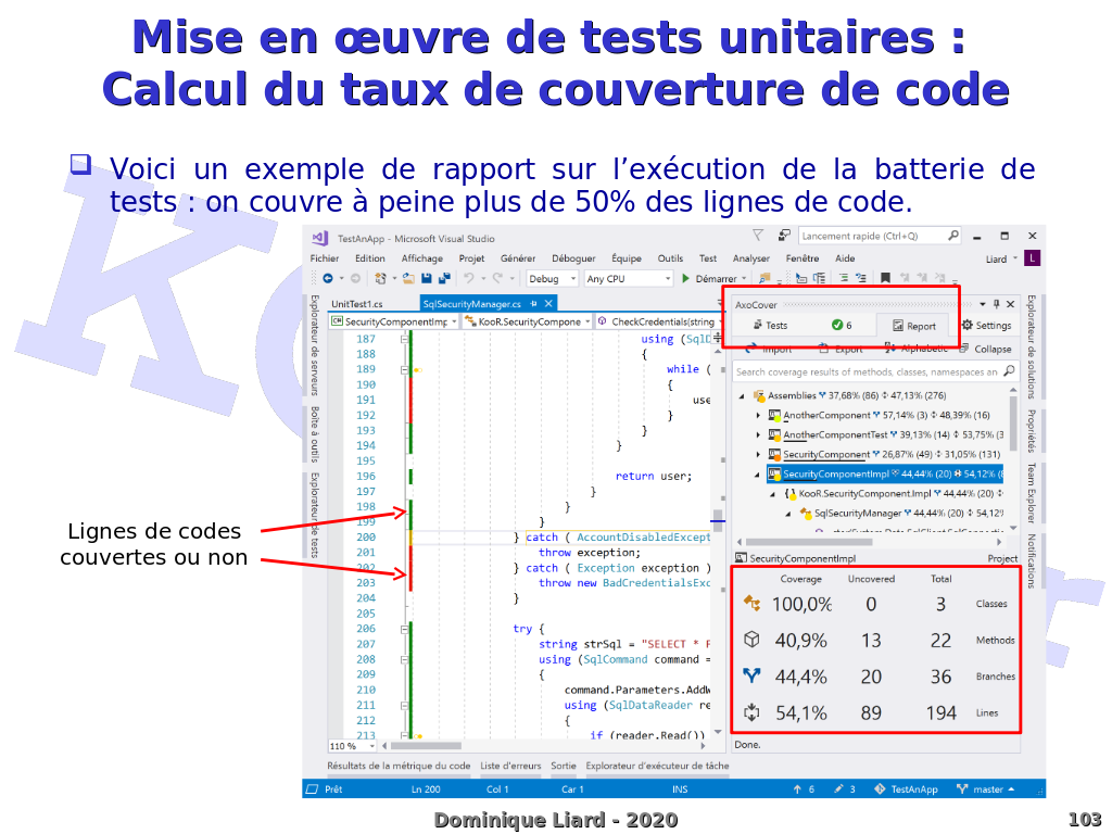 Mise en ?uvre de tests unitaires : Calcul du taux de couverture de code Voici un exemple de rapport sur l'exécution de la batterie de tests : on couvre à peine plus de 50% des lignes de code. Lignes de codescouvertes ou non