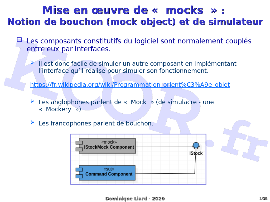 Mise en ?uvre de « mocks » : Notion de bouchon (mock object) et de simulateur Les composants constitutifs du logiciel sont normalement couplés entre eux par interfaces.