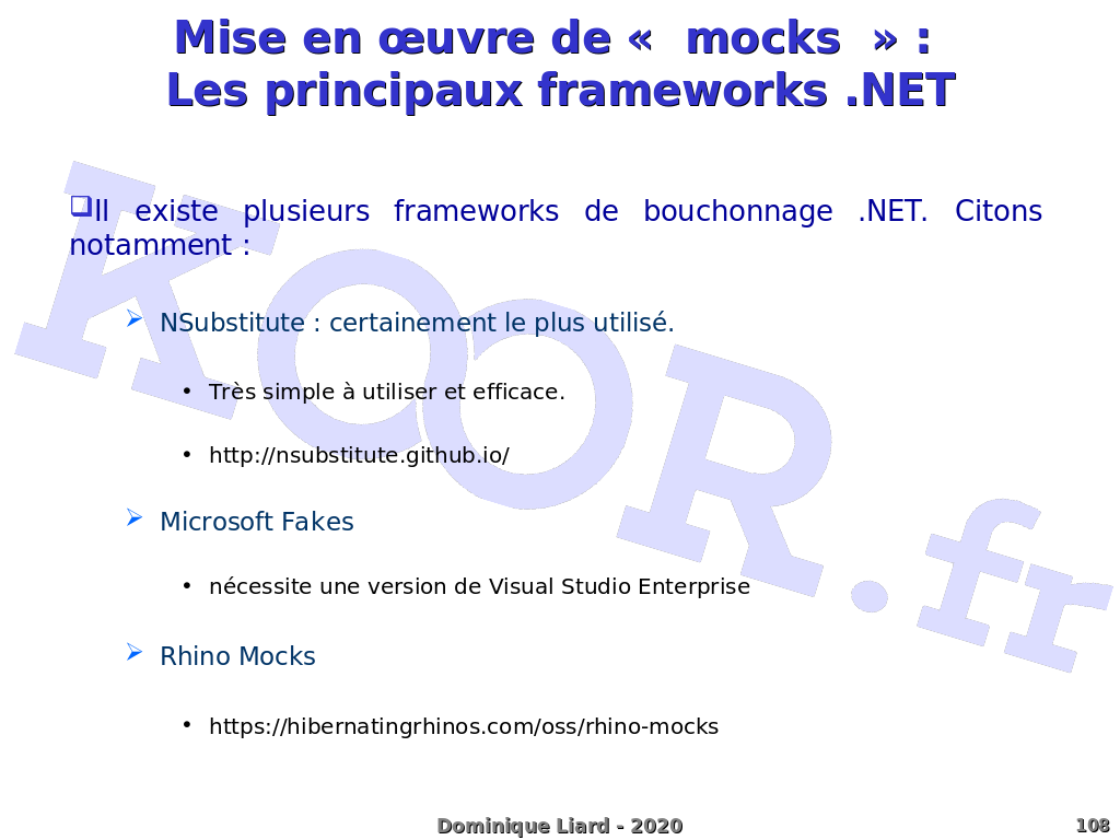 Mise en ?uvre de « mocks » : Les principaux frameworks .NET Il existe plusieurs frameworks de bouchonnage .NET. Citons notamment : NSubstitute : certainement le plus utilisé. Très simple à utiliser et efficace. http://nsubstitute.github.io/ Microsoft Fakes nécessite une version de Visual Studio Enterprise Rhino Mocks https://hibernatingrhinos.com/oss/rhino-mocks
