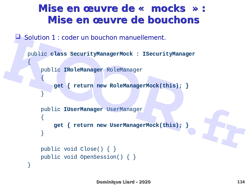 Mise en ?uvre de « mocks » : Mise en ?uvre de bouchons Solution 1 : coder un bouchon manuellement. public class SecurityManagerMock : ISecurityManager { public IRoleManager RoleManager { get { return new RoleManagerMock(this); } } public IUserManager UserManager { get { return new UserManagerMock(this); } } public void Close() { } public void OpenSession() { } }