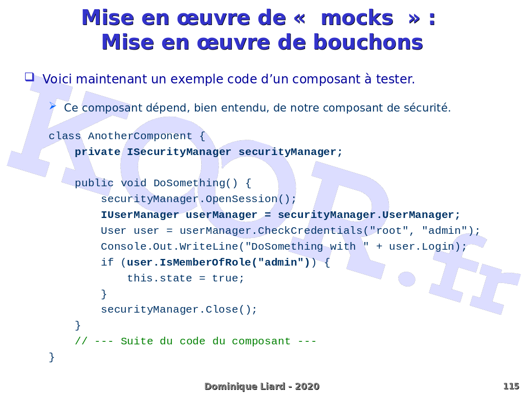 Mise en ?uvre de « mocks » : Mise en ?uvre de bouchons Voici maintenant un exemple code d'un composant à tester. Ce composant dépend, bien entendu, de notre composant de sécurité. class AnotherComponent { private ISecurityManager securityManager; public void DoSomething() { securityManager.OpenSession(); IUserManager userManager = securityManager.UserManager; User user = userManager.CheckCredentials("root", "admin"); Console.Out.WriteLine("DoSomething with " + user.Login); if (user.IsMemberOfRole("admin")) { this.state = true; } securityManager.Close(); } // --- Suite du code du composant --- }