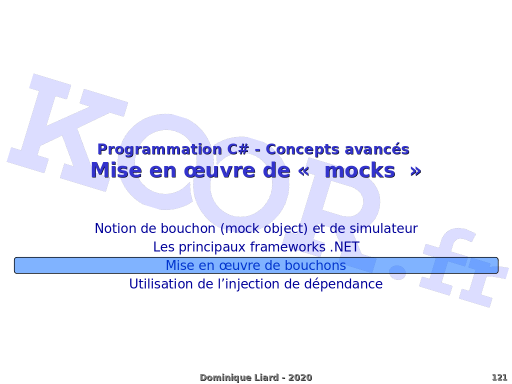 Programmation C# - Concepts avancés Mise en ?uvre de « mocks » Notion de bouchon (mock object) et de simulateur Les principaux frameworks .NET Mise en ?uvre de bouchons Utilisation de l'injection de dépendance