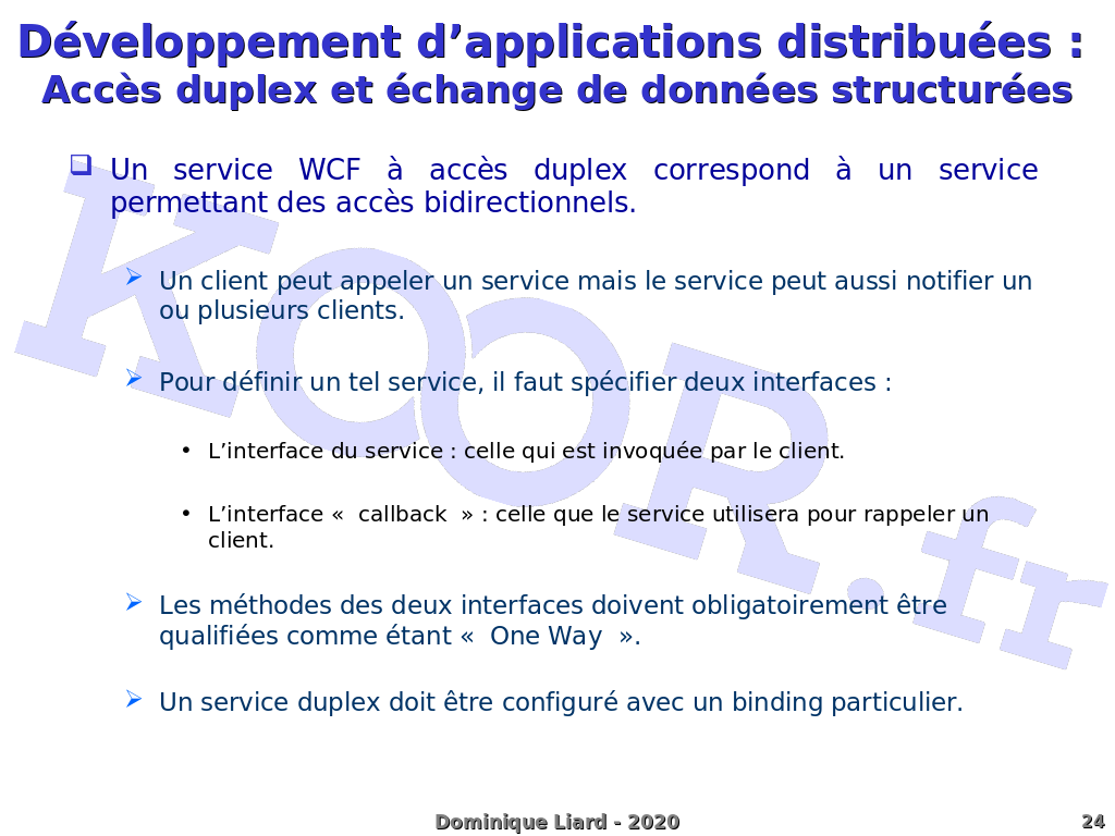 Développement d'applications distribuées : Accès duplex et échange de données structurées Un service WCF à accès duplex correspond à un service permettant des accès bidirectionnels. Un client peut appeler un service mais le service peut aussi notifier un ou plusieurs clients. Pour définir un tel service, il faut spécifier deux interfaces : L'interface du service : celle qui est invoquée par le client. L'interface « callback » : celle que le service utilisera pour rappeler un client. Les méthodes des deux interfaces doivent obligatoirement être qualifiées comme étant « One Way ». Un service duplex doit être configuré avec un binding particulier.