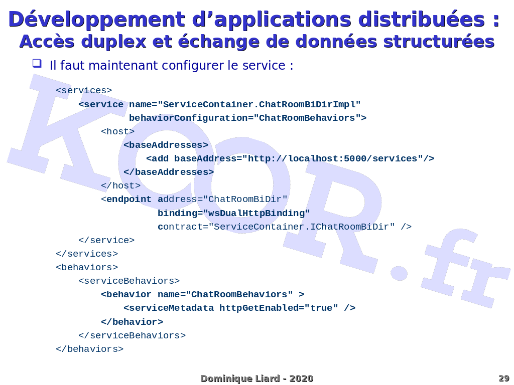 Développement d'applications distribuées : Accès duplex et échange de données structurées Il faut maintenant configurer le service : <services> <service name="ServiceContainer.ChatRoomBiDirImpl" behaviorConfiguration="ChatRoomBehaviors"> <host> <baseAddresses> <add baseAddress="http://localhost:5000/services"/> </baseAddresses> </host> <endpoint address="ChatRoomBiDir" binding="wsDualHttpBinding" contract="ServiceContainer.IChatRoomBiDir" /> </service> </services> <behaviors> <serviceBehaviors> <behavior name="ChatRoomBehaviors" > <serviceMetadata httpGetEnabled="true" /> </behavior> </serviceBehaviors> </behaviors>