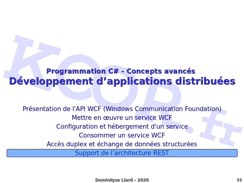 Programmation C# - Concepts avancés Développement d'applications distribuées Présentation de l'API WCF (Windows Communication Foundation) Mettre en ?uvre un service WCF Configuration et hébergement d'un service Consommer un service WCF Accès duplex et échange de données structurées Support de l'architecture REST
