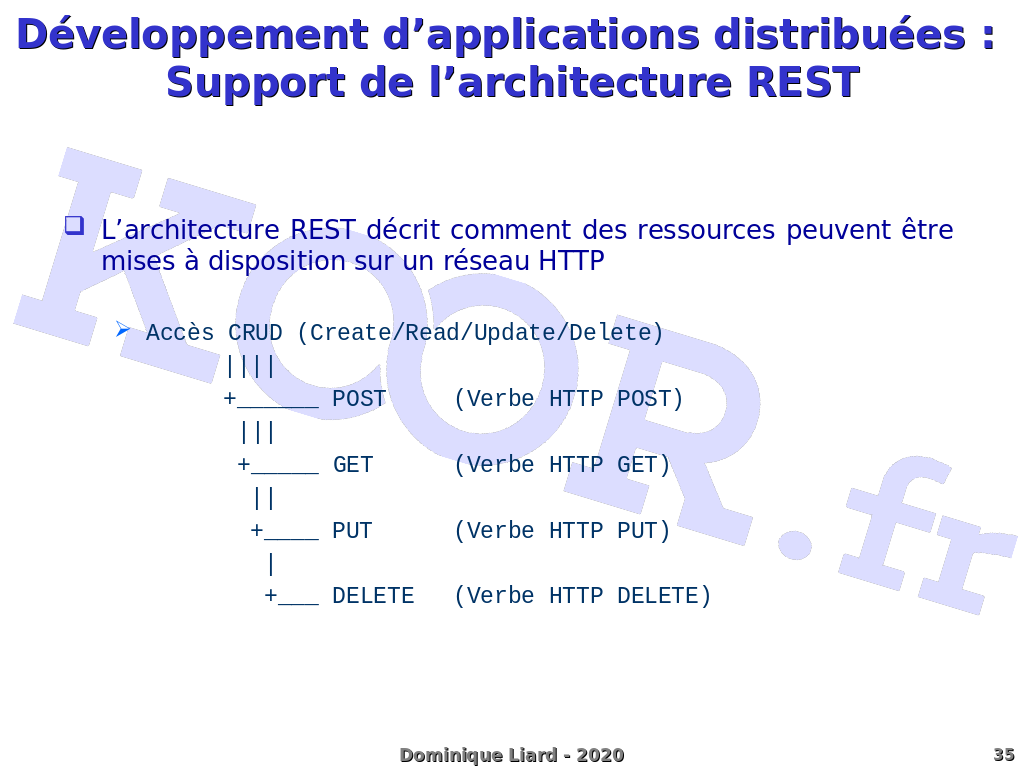 Développement d'applications distribuées : Support de l'architecture REST L'architecture REST décrit comment des ressources peuvent être mises à disposition sur un réseau HTTP Accès CRUD (Create/Read/Update/Delete) |||| +______ POST (Verbe HTTP POST) ||| +_____ GET (Verbe HTTP GET) || +____ PUT (Verbe HTTP PUT) | +___ DELETE (Verbe HTTP DELETE)