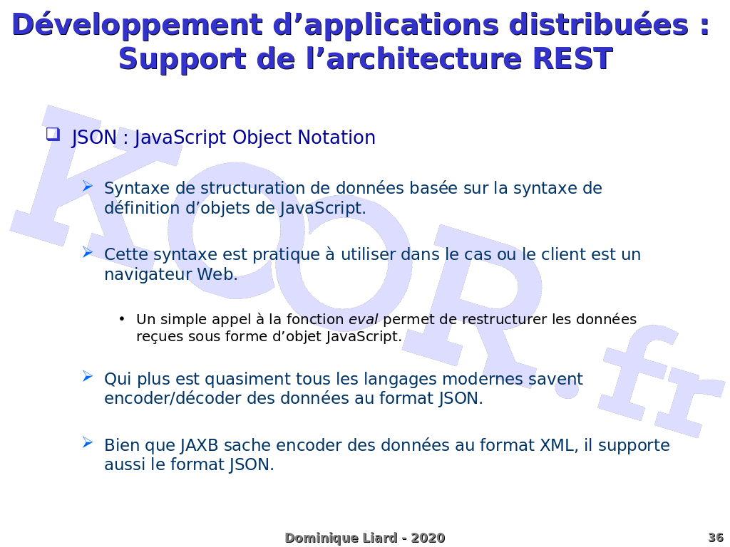 Développement d'applications distribuées : Support de l'architecture REST JSON : JavaScript Object Notation Syntaxe de structuration de données basée sur la syntaxe de définition d'objets de JavaScript. Cette syntaxe est pratique à utiliser dans le cas ou le client est un navigateur Web. Un simple appel à la fonction eval permet de restructurer les données reçues sous forme d'objet JavaScript. Qui plus est quasiment tous les langages modernes savent encoder/décoder des données au format JSON. Bien que JAXB sache encoder des données au format XML, il supporte aussi le format JSON.