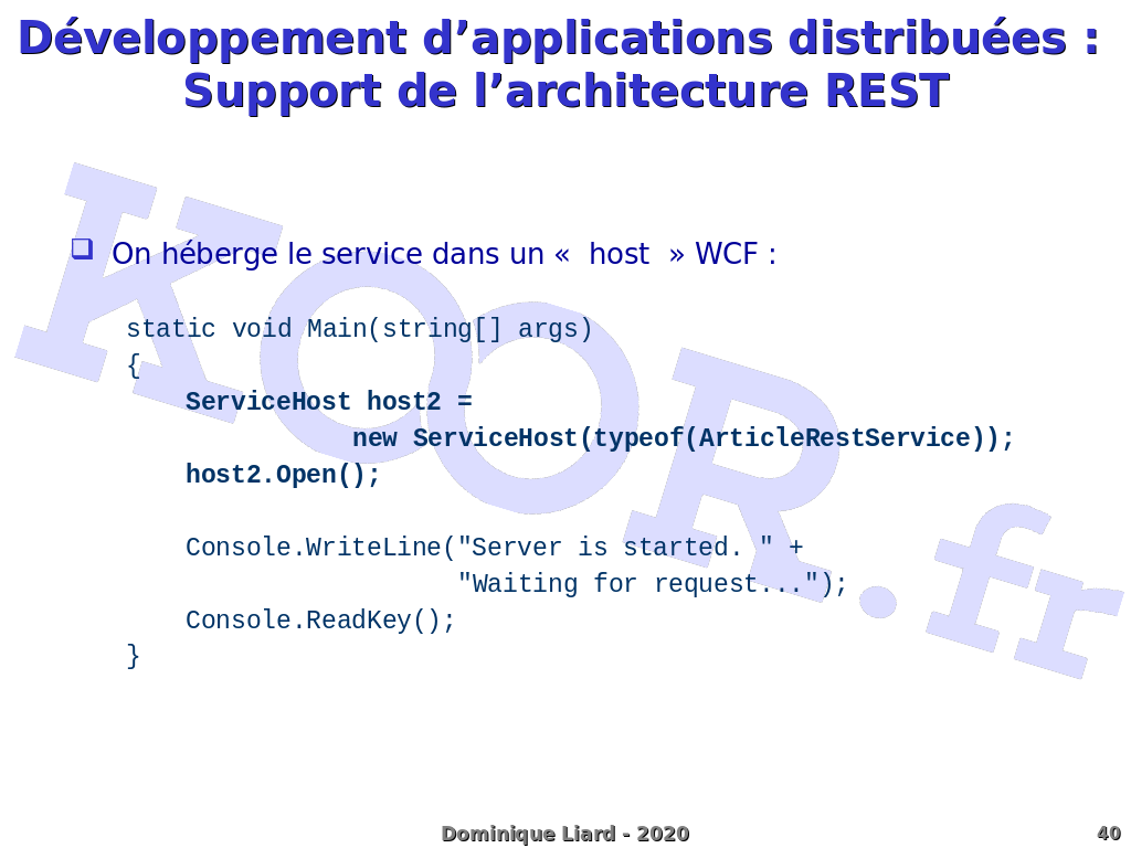 Développement d'applications distribuées : Support de l'architecture REST On héberge le service dans un « host » WCF : static void Main(string[] args) { ServiceHost host2 = new ServiceHost(typeof(ArticleRestService)); host2.Open(); Console.WriteLine("Server is started. " + "Waiting for request..."); Console.ReadKey(); }