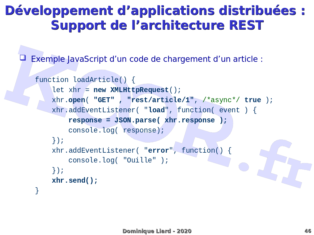 Développement d'applications distribuées : Support de l'architecture REST Exemple JavaScript d'un code de chargement d'un article : function loadArticle() { let xhr = new XMLHttpRequest(); xhr.open( "GET" , "rest/article/1", /*async*/ true ); xhr.addEventListener( "load", function( event ) { response = JSON.parse( xhr.response ); console.log( response); }); xhr.addEventListener( "error", function() { console.log( "Ouille" ); }); xhr.send(); }