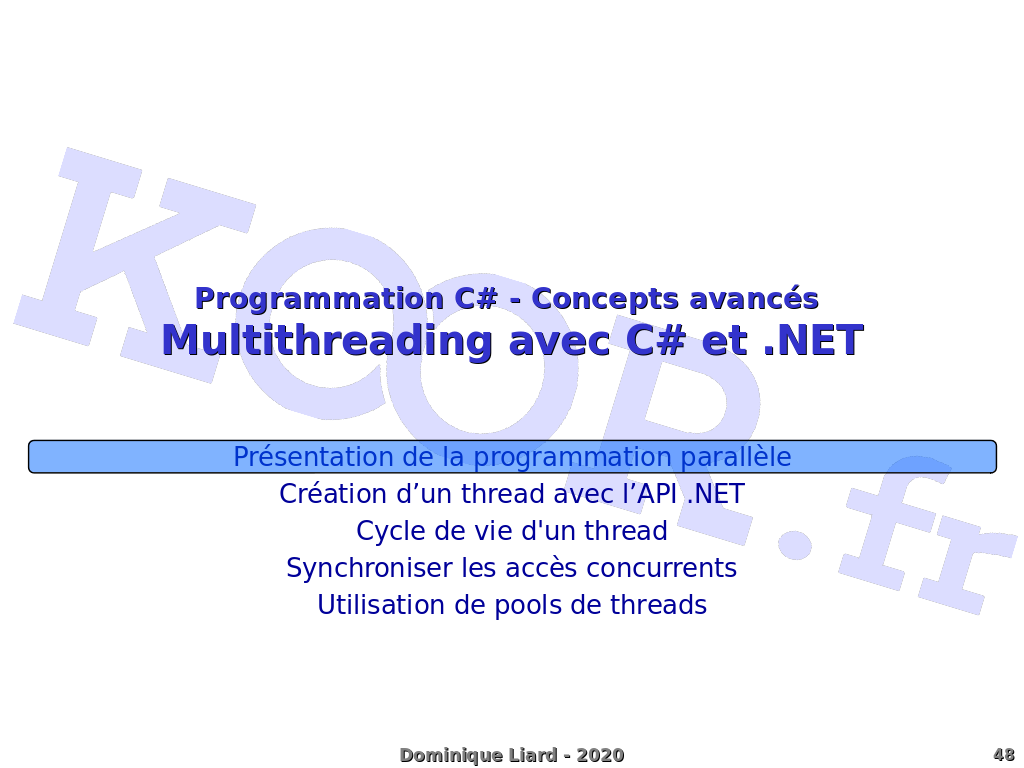 Programmation C# - Concepts avancés Multithreading avec C# et .NET Présentation de la programmation parallèle Création d'un thread avec l'API .NET Cycle de vie d'un thread Synchroniser les accès concurrents Utilisation de pools de threads