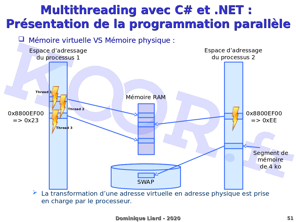Multithreading avec C# et .NET : Présentation de la programmation parallèle Mémoire virtuelle VS Mémoire physique : La transformation d'une adresse virtuelle en adresse physique est prise en charge par le processeur. Espace d'adressagedu processus 1 Espace d'adressagedu processus 2