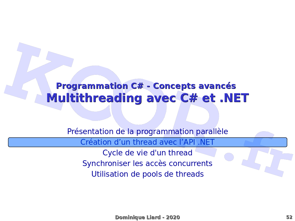 Programmation C# - Concepts avancés Multithreading avec C# et .NET Présentation de la programmation parallèle Création d'un thread avec l'API .NET Cycle de vie d'un thread Synchroniser les accès concurrents Utilisation de pools de threads
