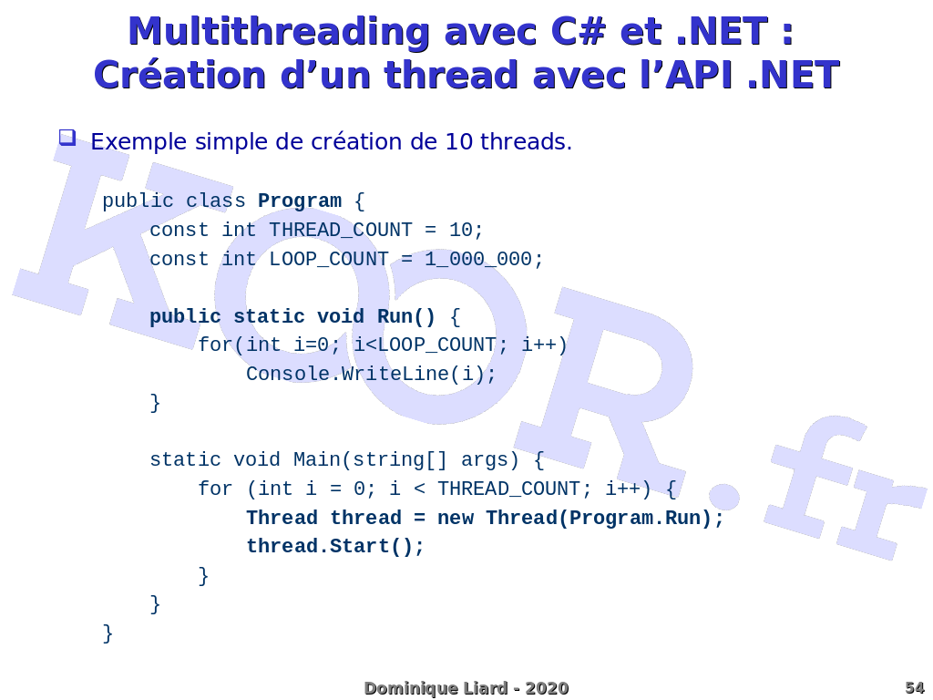 Multithreading avec C# et .NET : Création d'un thread avec l'API .NET Exemple simple de création de 10 threads. public class Program { const int THREAD_COUNT = 10; const int LOOP_COUNT = 1_000_000; public static void Run() { for(int i=0; i<LOOP_COUNT; i++) Console.WriteLine(i); } static void Main(string[] args) { for (int i = 0; i < THREAD_COUNT; i++) { Thread thread = new Thread(Program.Run); thread.Start(); } } }