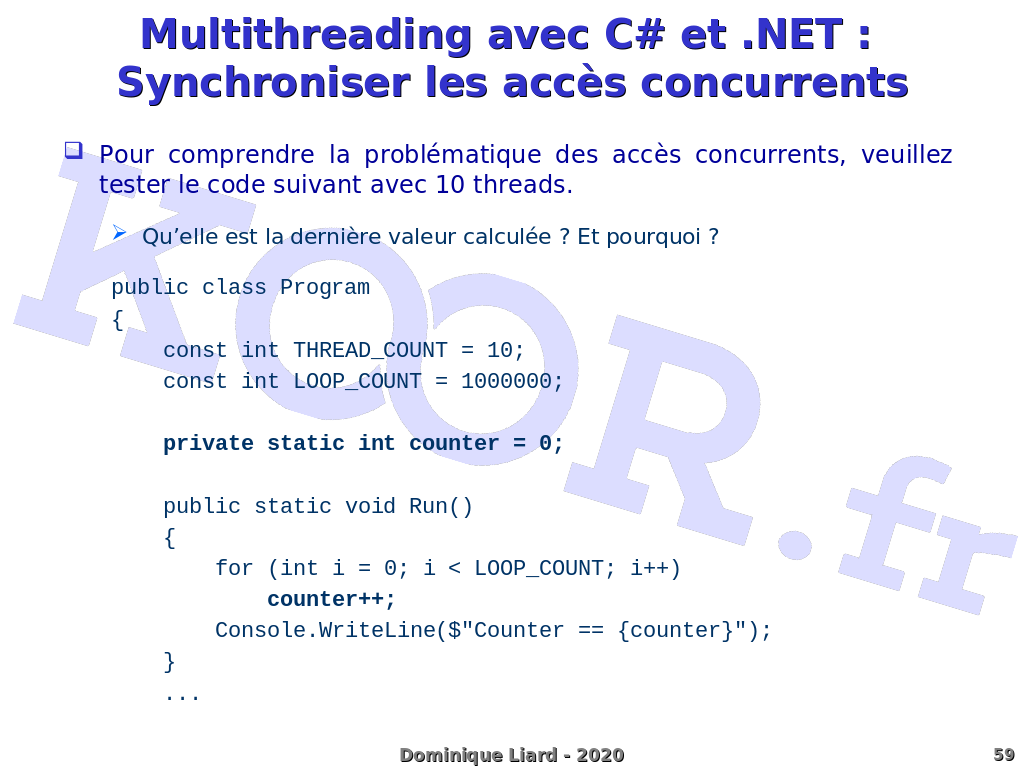 Multithreading avec C# et .NET : Synchroniser les accès concurrents Pour comprendre la problématique des accès concurrents, veuillez tester le code suivant avec 10 threads. Qu'elle est la dernière valeur calculée ? Et pourquoi ? public class Program { const int THREAD_COUNT = 10; const int LOOP_COUNT = 1000000; private static int counter = 0; public static void Run() { for (int i = 0; i < LOOP_COUNT; i++) counter++; Console.WriteLine($"Counter == {counter}"); } ...