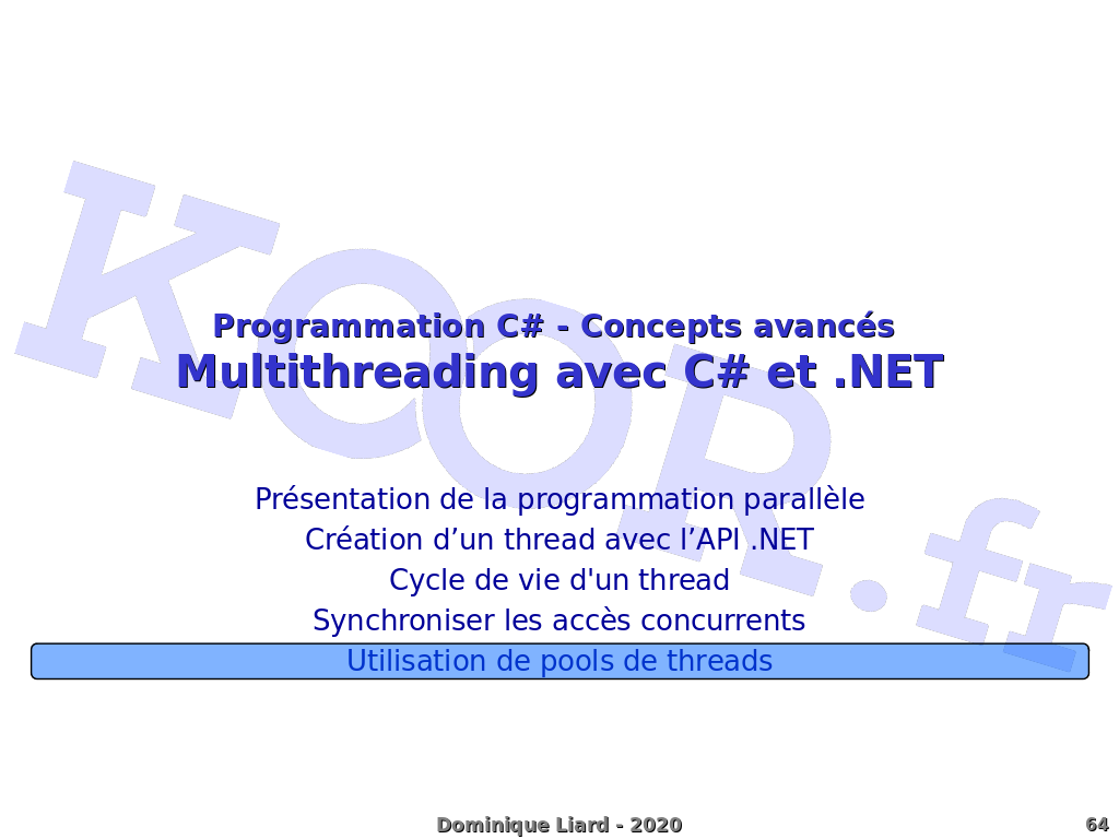 Programmation C# - Concepts avancés Multithreading avec C# et .NET Présentation de la programmation parallèle Création d'un thread avec l'API .NET Cycle de vie d'un thread Synchroniser les accès concurrents Utilisation de pools de threads