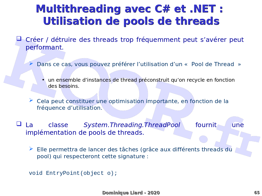 Multithreading avec C# et .NET : Utilisation de pools de threads Créer / détruire des threads trop fréquemment peut s'avérer peut performant. Dans ce cas, vous pouvez préférer l'utilisation d'un « Pool de Thread » un ensemble d'instances de thread préconstruit qu'on recycle en fonction des besoins. Cela peut constituer une optimisation importante, en fonction de la fréquence d'utilisation. La classe System.Threading.ThreadPool fournit une implémentation de pools de threads. Elle permettra de lancer des tâches (grâce aux différents threads du pool) qui respecteront cette signature : void EntryPoint(object o);