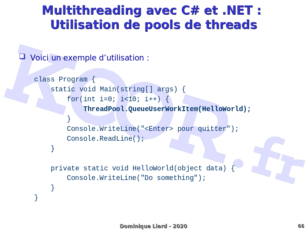 Multithreading avec C# et .NET : Utilisation de pools de threads Voici un exemple d'utilisation : class Program { static void Main(string[] args) { for(int i=0; i<10; i++) { ThreadPool.QueueUserWorkItem(HelloWorld); } Console.WriteLine("<Enter> pour quitter"); Console.ReadLine(); } private static void HelloWorld(object data) { Console.WriteLine("Do something"); } }