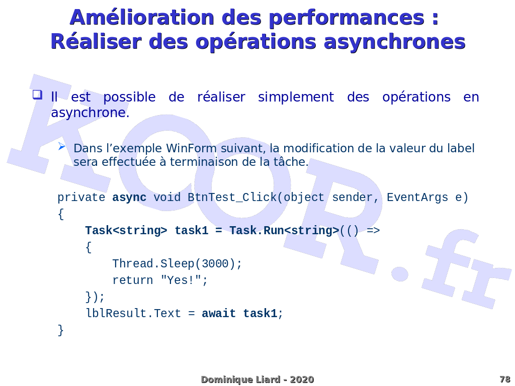 Amélioration des performances : Réaliser des opérations asynchrones Il est possible de réaliser simplement des opérations en asynchrone. Dans l'exemple WinForm suivant, la modification de la valeur du label sera effectuée à terminaison de la tâche. private async void BtnTest_Click(object sender, EventArgs e) { Task<string> task1 = Task.Run<string>(() => { Thread.Sleep(3000); return "Yes!"; }); lblResult.Text = await task1; }