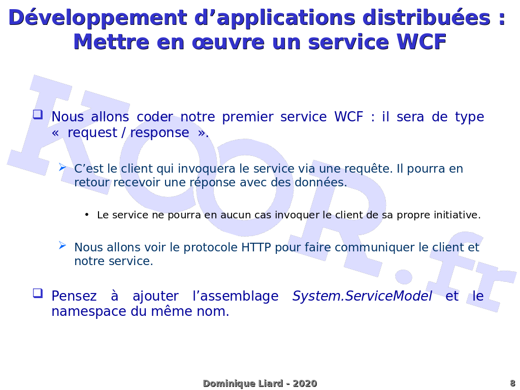 Développement d'applications distribuées : Mettre en ?uvre un service WCF Nous allons coder notre premier service WCF : il sera de type « request / response ». C'est le client qui invoquera le service via une requête. Il pourra en retour recevoir une réponse avec des données. Le service ne pourra en aucun cas invoquer le client de sa propre initiative. Nous allons voir le protocole HTTP pour faire communiquer le client et notre service. Pensez à ajouter l'assemblage System.ServiceModel et le namespace du même nom.