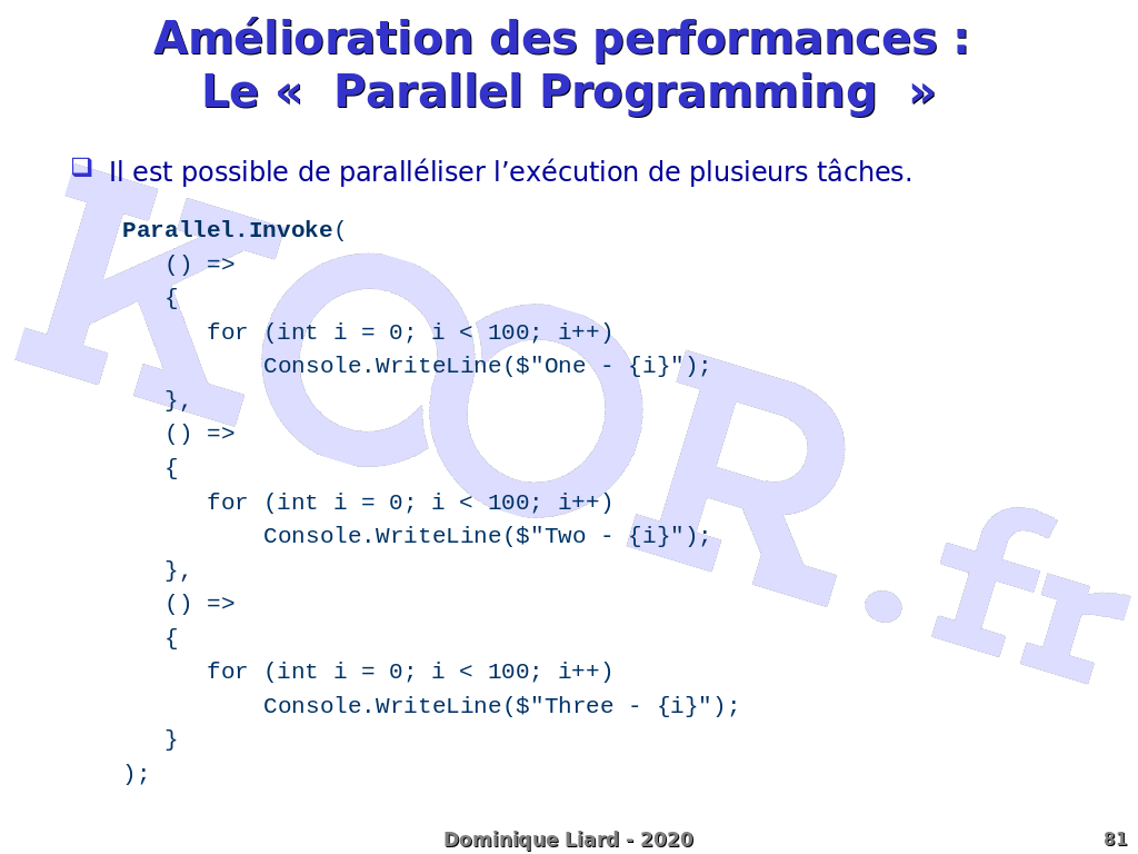 Amélioration des performances : Le « Parallel Programming » Il est possible de paralléliser l'exécution de plusieurs tâches. Parallel.Invoke( () => { for (int i = 0; i < 100; i++) Console.WriteLine($"One - {i}"); }, () => { for (int i = 0; i < 100; i++) Console.WriteLine($"Two - {i}"); }, () => { for (int i = 0; i < 100; i++) Console.WriteLine($"Three - {i}"); } );