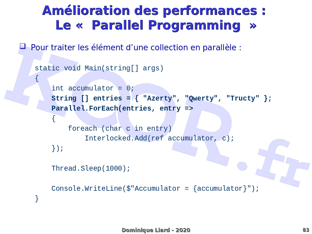 Amélioration des performances : Le « Parallel Programming » Pour traiter les élément d'une collection en parallèle : static void Main(string[] args) { int accumulator = 0; String [] entries = { "Azerty", "Qwerty", "Tructy" }; Parallel.ForEach(entries, entry => { foreach (char c in entry) Interlocked.Add(ref accumulator, c); }); Thread.Sleep(1000); Console.WriteLine($"Accumulator = {accumulator}"); }