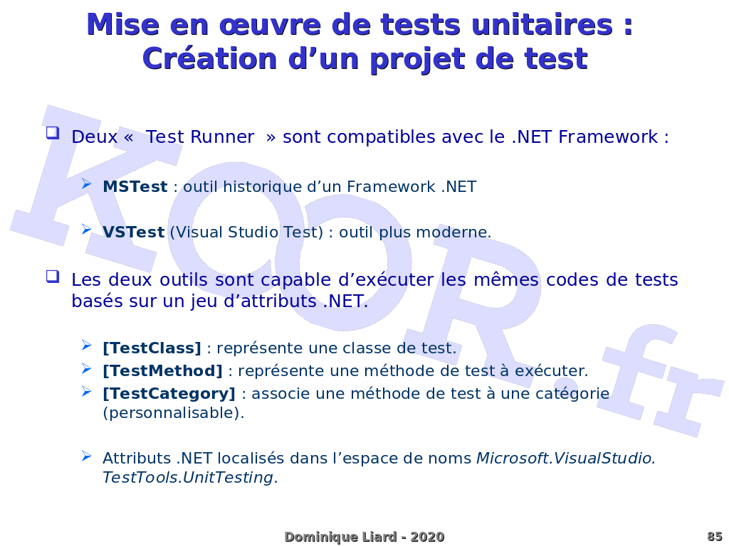 Mise en ?uvre de tests unitaires : Création d'un projet de test Deux « Test Runner » sont compatibles avec le .NET Framework : MSTest : outil historique d'un Framework .NET VSTest (Visual Studio Test) : outil plus moderne. Les deux outils sont capable d'exécuter les mêmes codes de tests basés sur un jeu d'attributs .NET. [TestClass] : représente une classe de test. [TestMethod] : représente une méthode de test à exécuter. [TestCategory] : associe une méthode de test à une catégorie (personnalisable). Attributs .NET localisés dans l'espace de noms Microsoft.VisualStudio.TestTools.UnitTesting.