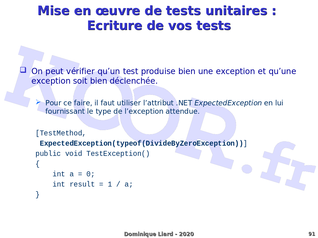 Mise en ?uvre de tests unitaires : Ecriture de vos tests On peut vérifier qu'un test produise bien une exception et qu'une exception soit bien déclenchée. Pour ce faire, il faut utiliser l'attribut .NET ExpectedException en lui fournissant le type de l'exception attendue. [TestMethod, ExpectedException(typeof(DivideByZeroException))] public void TestException() { int a = 0; int result = 1 / a; }