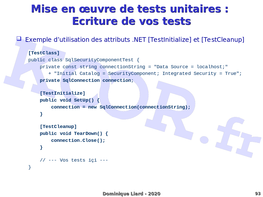 Mise en ?uvre de tests unitaires : Ecriture de vos tests Exemple d'utilisation des attributs .NET [TestInitialize] et [TestCleanup] [TestClass] public class SqlSecurityComponentTest { private const string connectionString = "Data Source = localhost;" + "Initial Catalog = SecurityComponent; Integrated Security = True"; private SqlConnection connection; [TestInitialize] public void SetUp() { connection = new SqlConnection(connectionString); } [TestCleanup] public void TearDown() { connection.Close(); } // --- Vos tests içi --- }