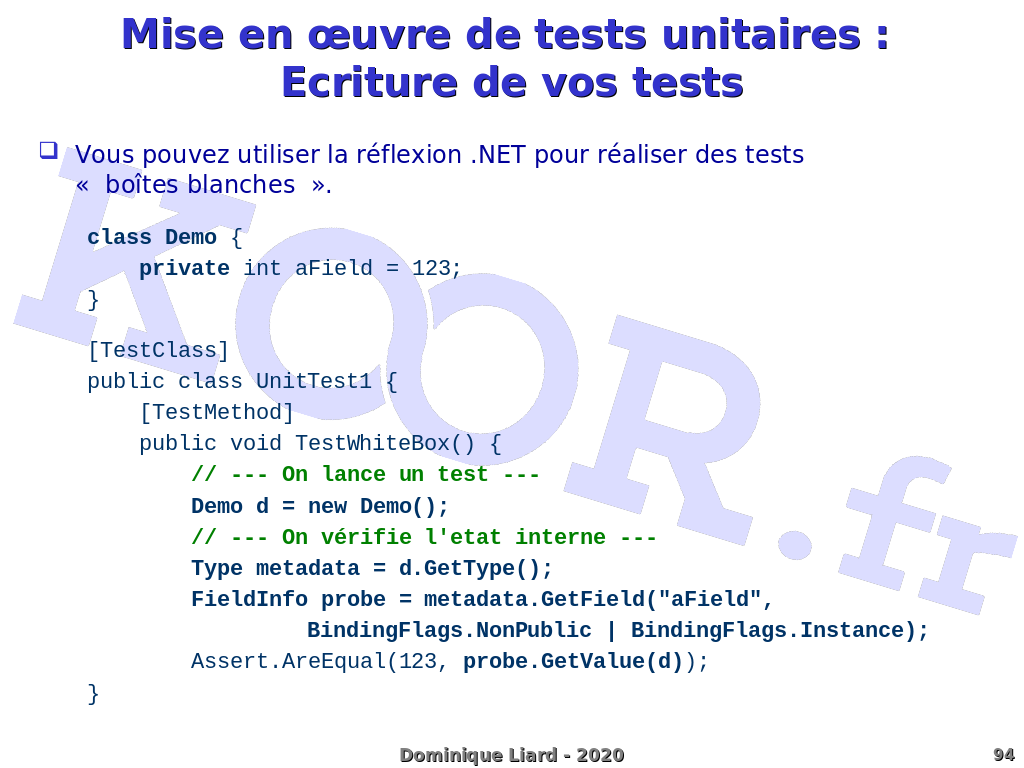 Mise en ?uvre de tests unitaires : Ecriture de vos tests Vous pouvez utiliser la réflexion .NET pour réaliser des tests « boîtes blanches ». class Demo { private int aField = 123; } [TestClass] public class UnitTest1 { [TestMethod] public void TestWhiteBox() { // --- On lance un test --- Demo d = new Demo(); // --- On vérifie l'etat interne --- Type metadata = d.GetType(); FieldInfo probe = metadata.GetField("aField", BindingFlags.NonPublic | BindingFlags.Instance); Assert.AreEqual(123, probe.GetValue(d)); }