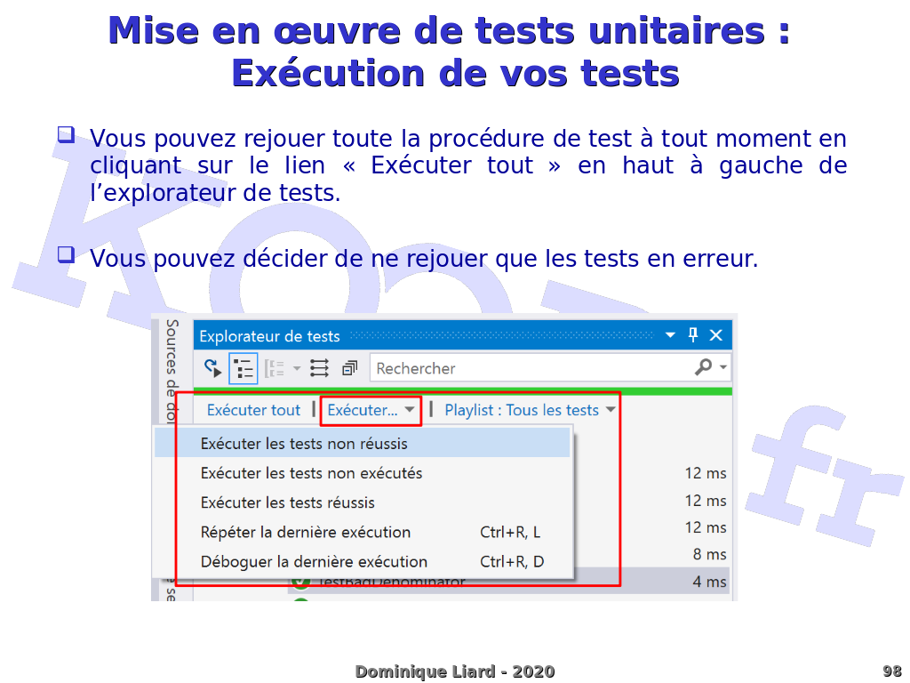 Mise en ?uvre de tests unitaires : Exécution de vos tests Vous pouvez rejouer toute la procédure de test à tout moment en cliquant sur le lien « Exécuter tout » en haut à gauche de l'explorateur de tests. Vous pouvez décider de ne rejouer que les tests en erreur.
