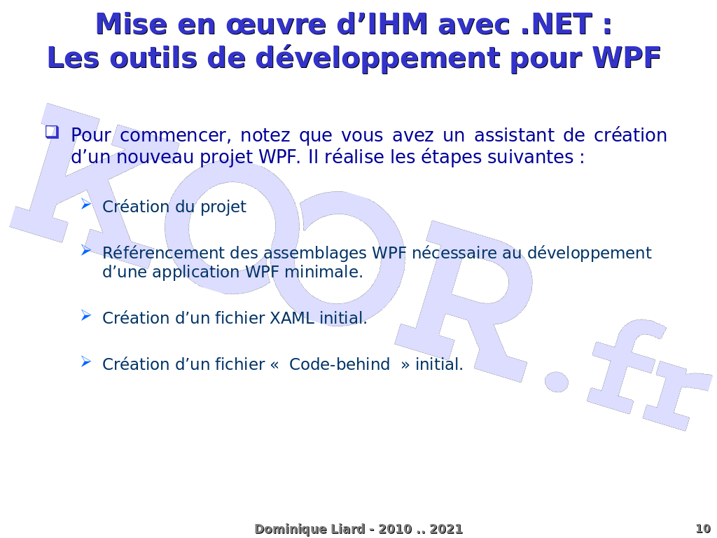 Mise en ?uvre d'IHM avec .NET : Les outils de développement pour WPF Pour commencer, notez que vous avez un assistant de création d'un nouveau projet WPF. Il réalise les étapes suivantes : Création du projet Référencement des assemblages WPF nécessaire au développement d'une application WPF minimale. Création d'un fichier XAML initial. Création d'un fichier « Code-behind » initial. Dominique Liard - 2010 .. 2021