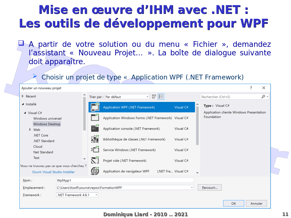 Mise en ?uvre d'IHM avec .NET : Les outils de développement pour WPF A partir de votre solution ou du menu « Fichier », demandez l'assistant « Nouveau Projet? ». La boîte de dialogue suivante doit apparaître. Choisir un projet de type « Application WPF (.NET Framework) Dominique Liard - 2010 .. 2021