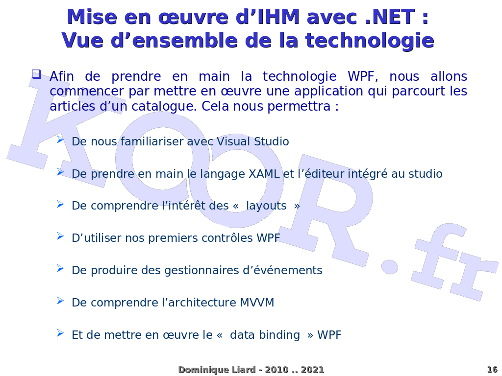 Mise en ?uvre d'IHM avec .NET : Vue d'ensemble de la technologie Afin de prendre en main la technologie WPF, nous allons commencer par mettre en ?uvre une application qui parcourt les articles d'un catalogue. Cela nous permettra : De nous familiariser avec Visual Studio De prendre en main le langage XAML et l'éditeur intégré au studio De comprendre l'intérêt des « layouts » D'utiliser nos premiers contrôles WPF De produire des gestionnaires d'événements De comprendre l'architecture MVVM Et de mettre en ?uvre le « data binding » WPF Dominique Liard - 2010 .. 2021
