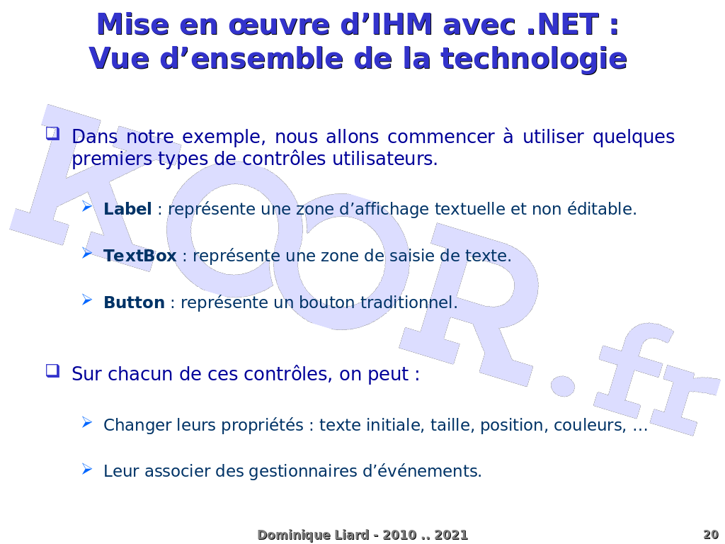 Mise en ?uvre d'IHM avec .NET : Vue d'ensemble de la technologie Dans notre exemple, nous allons commencer à utiliser quelques premiers types de contrôles utilisateurs. Label : représente une zone d'affichage textuelle et non éditable. TextBox : représente une zone de saisie de texte. Button : représente un bouton traditionnel. Sur chacun de ces contrôles, on peut : Changer leurs propriétés : texte initiale, taille, position, couleurs, ? Leur associer des gestionnaires d'événements. Dominique Liard - 2010 .. 2021