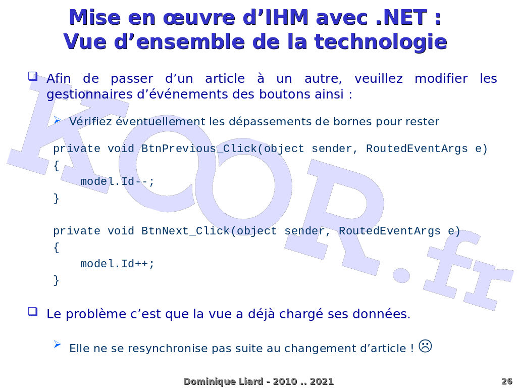 Mise en ?uvre d'IHM avec .NET : Vue d'ensemble de la technologie Afin de passer d'un article à un autre, veuillez modifier les gestionnaires d'événements des boutons ainsi : Vérifiez éventuellement les dépassements de bornes pour rester private void BtnPrevious_Click(object sender, RoutedEventArgs e) { model.Id--; } private void BtnNext_Click(object sender, RoutedEventArgs e) { model.Id++; } Le problème c'est que la vue a déjà chargé ses données. Elle ne se resynchronise pas suite au changement d'article ! ? Dominique Liard - 2010 .. 2021