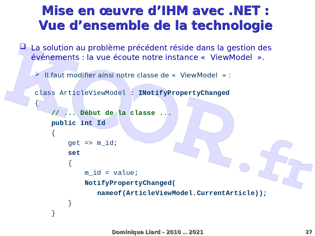 Mise en ?uvre d'IHM avec .NET : Vue d'ensemble de la technologie La solution au problème précédent réside dans la gestion des événements : la vue écoute notre instance « ViewModel ». Il faut modifier ainsi notre classe de « ViewModel » : class ArticleViewModel : INotifyPropertyChanged { // ... Début de la classe ... public int Id { get => m_id; set { m_id = value; NotifyPropertyChanged( nameof(ArticleViewModel.CurrentArticle)); } } Dominique Liard - 2010 .. 2021