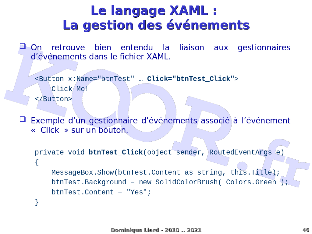 Le langage XAML : La gestion des événements On retrouve bien entendu la liaison aux gestionnaires d'événements dans le fichier XAML. <Button x:Name="btnTest" ? Click="btnTest_Click"> Click Me! </Button> Exemple d'un gestionnaire d'événements associé à l'événement « Click » sur un bouton. private void btnTest_Click(object sender, RoutedEventArgs e) { MessageBox.Show(btnTest.Content as string, this.Title); btnTest.Background = new SolidColorBrush( Colors.Green ); btnTest.Content = "Yes"; } Dominique Liard - 2010 .. 2021
