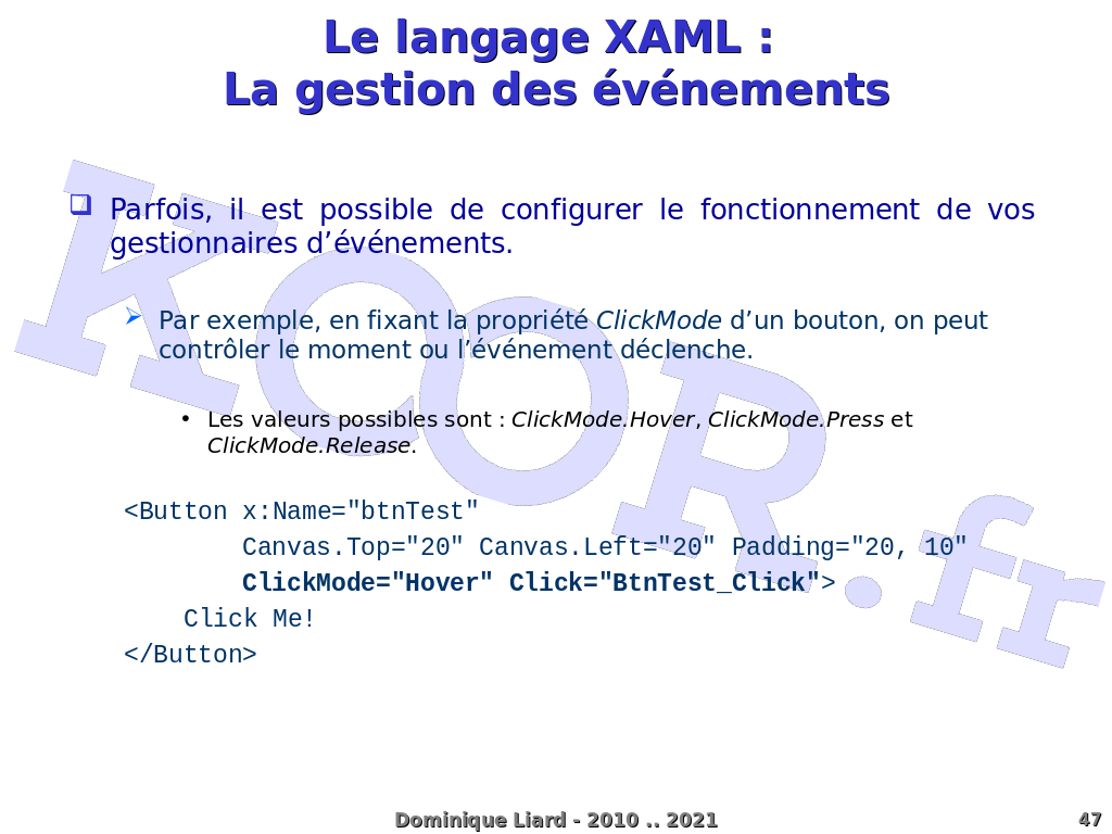Le langage XAML : La gestion des événements Parfois, il est possible de configurer le fonctionnement de vos gestionnaires d'événements. Par exemple, en fixant la propriété ClickMode d'un bouton, on peut contrôler le moment ou l'événement déclenche. Les valeurs possibles sont : ClickMode.Hover, ClickMode.Press et ClickMode.Release. <Button x:Name="btnTest" Canvas.Top="20" Canvas.Left="20" Padding="20, 10" ClickMode="Hover" Click="BtnTest_Click"> Click Me! </Button> Dominique Liard - 2010 .. 2021