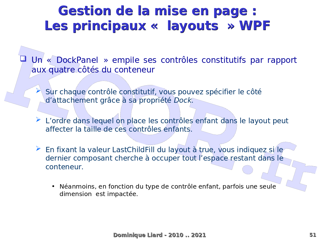 Gestion de la mise en page : Les principaux « layouts » WPF Un « DockPanel » empile ses contrôles constitutifs par rapport aux quatre côtés du conteneur Sur chaque contrôle constitutif, vous pouvez spécifier le côté d'attachement grâce à sa propriété Dock. L'ordre dans lequel on place les contrôles enfant dans le layout peut affecter la taille de ces contrôles enfants. En fixant la valeur LastChildFill du layout à true, vous indiquez si le dernier composant cherche à occuper tout l'espace restant dans le conteneur. Néanmoins, en fonction du type de contrôle enfant, parfois une seule dimension est impactée. Dominique Liard - 2010 .. 2021